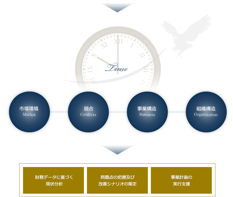 「売上減少」や「赤字体質」等といった状態に陥っている企業の事を「競争優位を低下させている企業」と呼びます。この競争優位性を低下させている企業を再び成長軌道に乗せるためには、「市場」「競合」「事業構造」「組織構造」そして、それら4つの変化とスピードを表す「時間」を徹底的に分析する事が必要です。