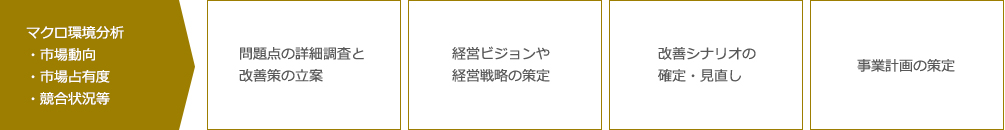 当社はクライアント企業の属する業界の市場動向・競合環境等を深く分析し、自らがクライアント企業の現場に立ち、クライアント企業の人材とともに事業構造、組織構造の改革を実行します。単なるコスト削減のようなネガティブな経営だけでは今後の成長は見込めません。