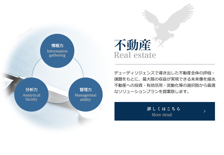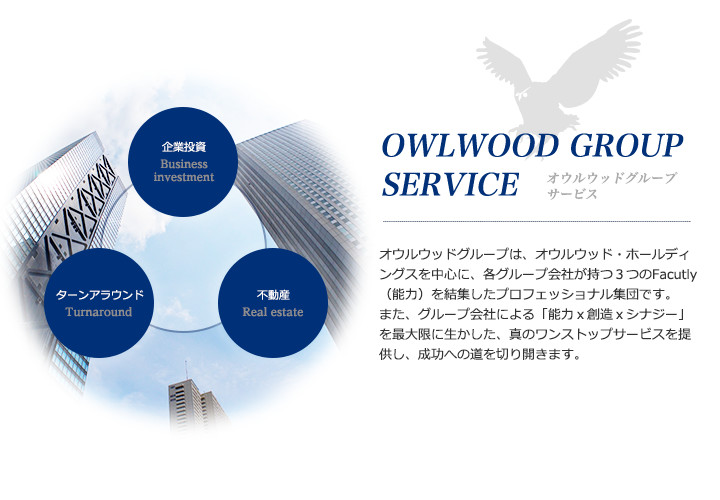 オウルウッドグループでは、不動産・事業再生・投資事業など、各々の分野で活躍するスタッフのスキルを融合し、カテゴリーなど全ての垣根を超え、今までの常識や慣習にとらわれる事のない全く新しいサービスを創造し、あらゆるニーズに迅速かつ柔軟に対応いたします。